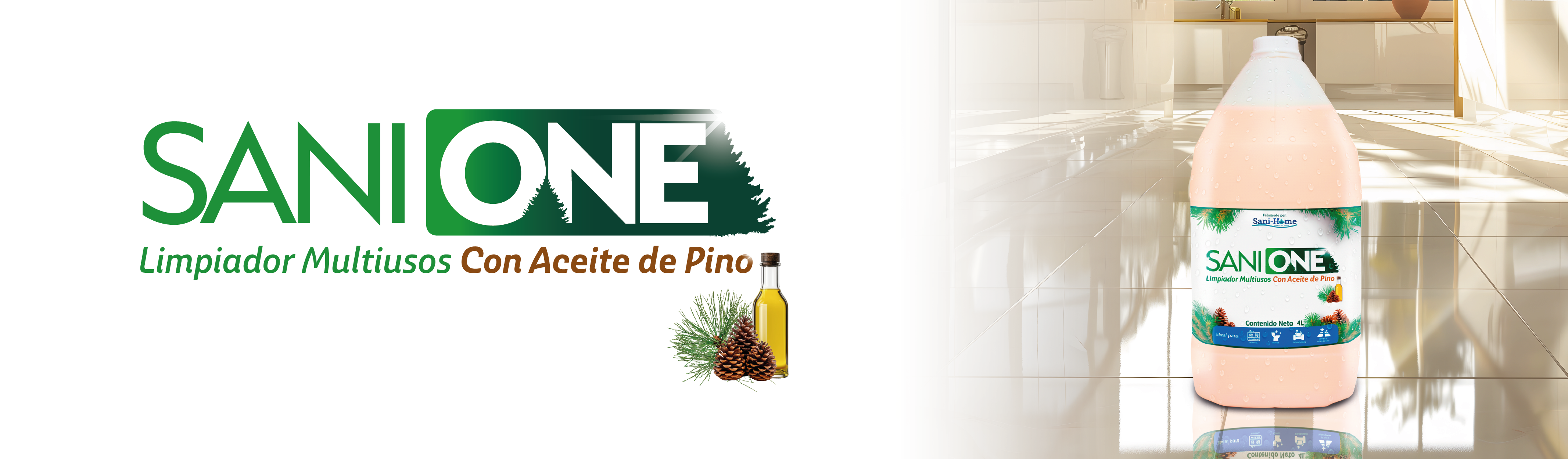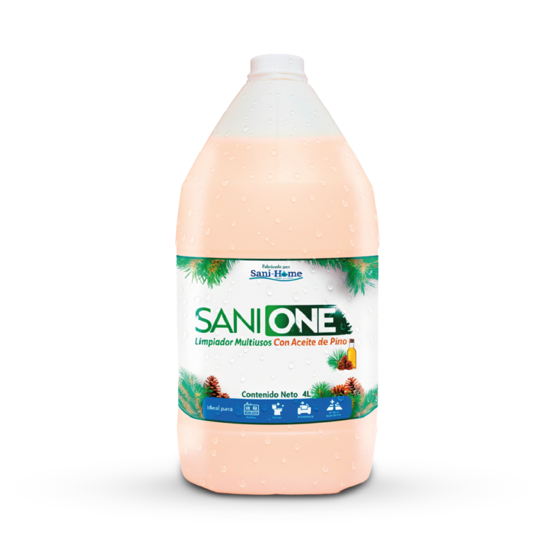 Limpiador multiusos con aceite de pino El limpiador multiusos con aceite de pino Sani-One es desinfectante, desengrasante, deja pisos sin rayaduras, además de un agradable aroma a bosque de pinos. Es ideal para pisos y superficies, baños, muebles y ropa. Presentaciones 500Ml | 1L | 4L | 20L ¿Necesitas mas información? Descarga nuestro folleto informativo Folleto aceite de pino